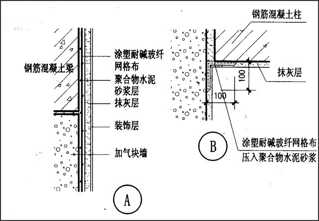 加氣混凝土砌塊設備網看圖來說明不同材料交界處構造和防裂處理方法