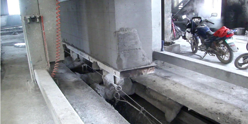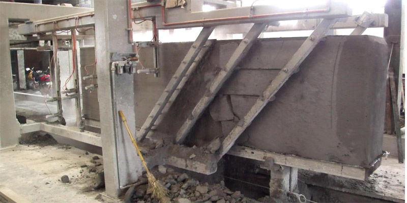 手動切割是一種簡單的切割方式,在模箱內按所需規(guī)格尺寸于澆注前預先安置鋼絲。豎切時,用吊具緩慢的提拉模箱即可,縱切可用人工來按照規(guī)格切割,這種方法在切割過程中,如遇到行車提拉不穩(wěn)定,忽快忽慢,或者遇到夾雜物,可能引起鋼絲偏移,造成切割的不準確,手動切割精度比機械切割稍微差一點。