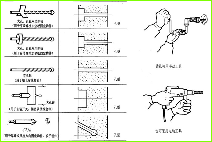 2 、擴孔鉆的形狀如下圖所示,一般可工地自制,用Φ14 ~16 鋼筋一端用火燒紅后打扁,然后兩邊向反方向打彎,斷面呈形開刃后即可。另一端用銑床出插口,插入電鉆即可使用,其使用方法是,進入墻體為直孔,到底后將鉆頭桿繞孔轉動,底部即成擴孔??淄鈴揭话銥?/span>035 、叨.孔頭約為中60 、65 ,這要視預埋件大小而定。深度應)100 (如吊掛物較重可適當加大深度)打入時與墻體呈45 度角,用水沖凈孔內渣末,灌聚合物水泥砂漿,插入鐵件。