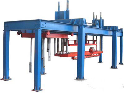 在加氣混凝土設備砌塊切割工藝中,翻轉吊具將模具凌空翻轉90度后脫模將坯體及側板一同至于切割臺上,啟動縱向切割裝置的行走電機對坯體進行側面切及 上、下水平分層階梯切割,在切割后行走至暫停位置,橫向切割裝置通過電機帶動行走至切割位后,啟動橫切架上、下垂直工作電機,橫切家自上而下,此時,擺動 電機啟動,并對坯體進行雙向交錯拉鋸式擺動,從而對批體進行上下垂直切割。在橫切架復位后(即切割完畢),橫向切割裝置繼續前行至暫停位。(待切割好的坯 體及側板經半成品吊具吊至蒸養小車,進行編組入釜蒸養出成品。)橫向縱向切割裝置行至初始位置。以此類推,周而復始,從而實現對坯體的切割。
