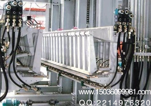 掰板機是加氣混凝土設備中比較重要的一部分,它具有龍門機架,龍門機架上裝有電機減速器、制動器、鏈輪傳動裝置和油泵,龍門機架內兩側沿長度方向設有上夾梁和下夾梁,上夾梁與下夾梁之間通過掰板油缸連接,上夾梁和下夾梁上分別裝有各自相對布置的若干夾緊油缸,上夾梁上的夾緊油缸與下夾梁上的夾緊油缸上下對應,鏈輪傳動裝置的鏈條與下夾梁連接,油泵通過液壓管路分別與掰板油缸和夾緊油缸相連,夾緊油缸的前端裝有夾緊體。本實用新型能夠機械化地將切割后的成型混凝土塊沿切縫分開并重新迭放在一起,不易損傷混凝土塊,生產效率高。 加氣混凝土設備掰板機用于將立式出釜的坯體由機械完成層與層的掰離,該機械安裝在加氣混凝土成品輸送端,可自動完成掰離程序。